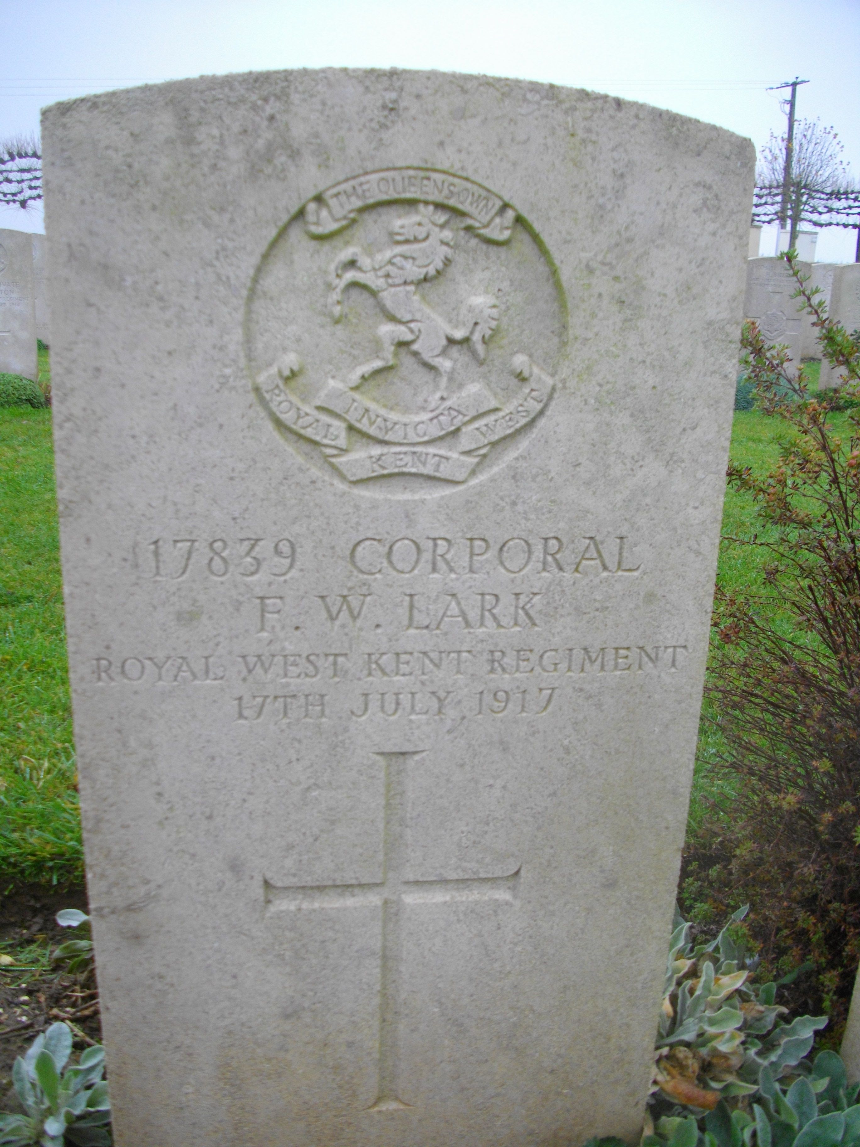Corporal Frederick William LARK, G/17839, 6th Battalion, Queens Own Royal West Kent Regiment, died of wounds, (gun shot wound to the back), 19 Casualty Clearing Station, France, 17th July 1917.