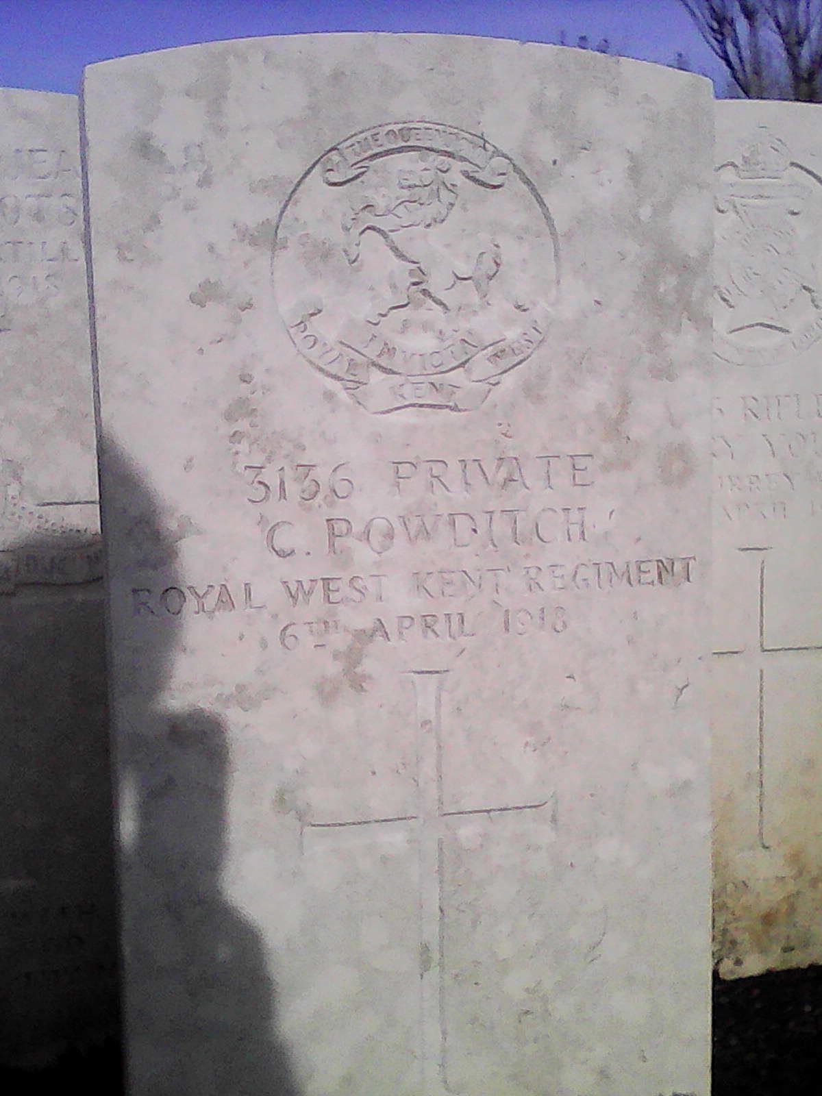Private Charles POWDITCH, G/3136, 6th Battalion, Queens Own Royal West Kent Regiment, died of wounds, (gun shot wounds, abdomen & left leg), 3rd Canadian Stationary Hospital, Doullens, France, 6th April 1918.