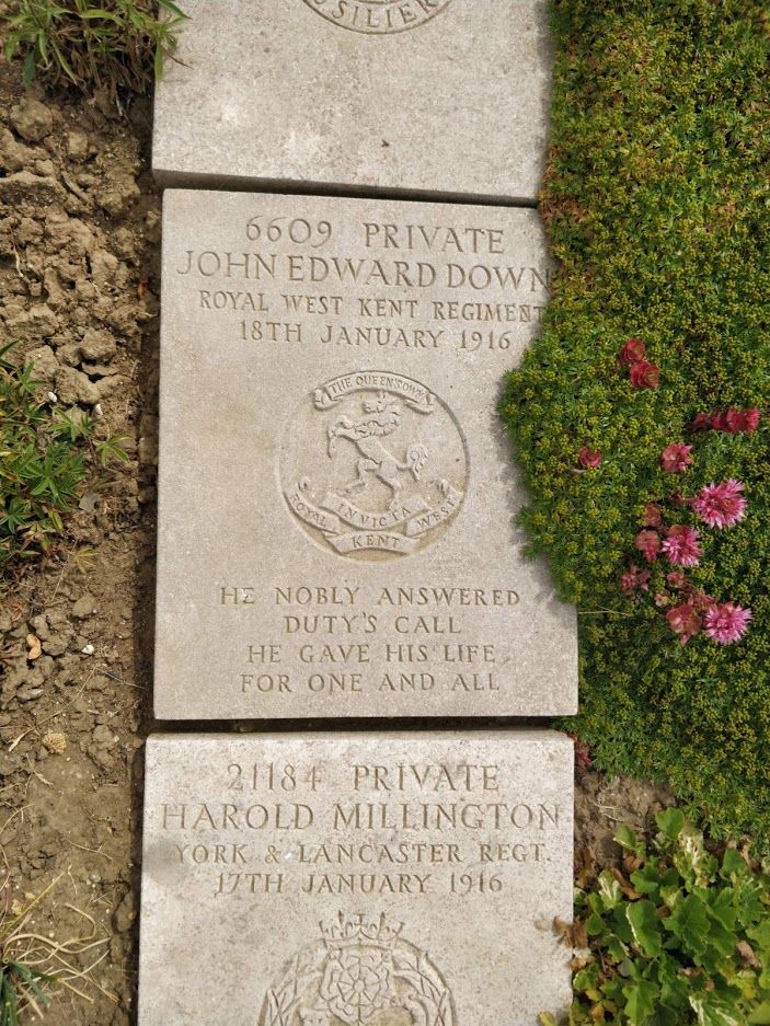 Private John Edward DOWNS, G/6609, 8th Battalion, Queens Own Royal West Kent Regiment, died of wounds, No.3. Stationary Hospital, Boulogne, France, 18th January 1916, age 32.
