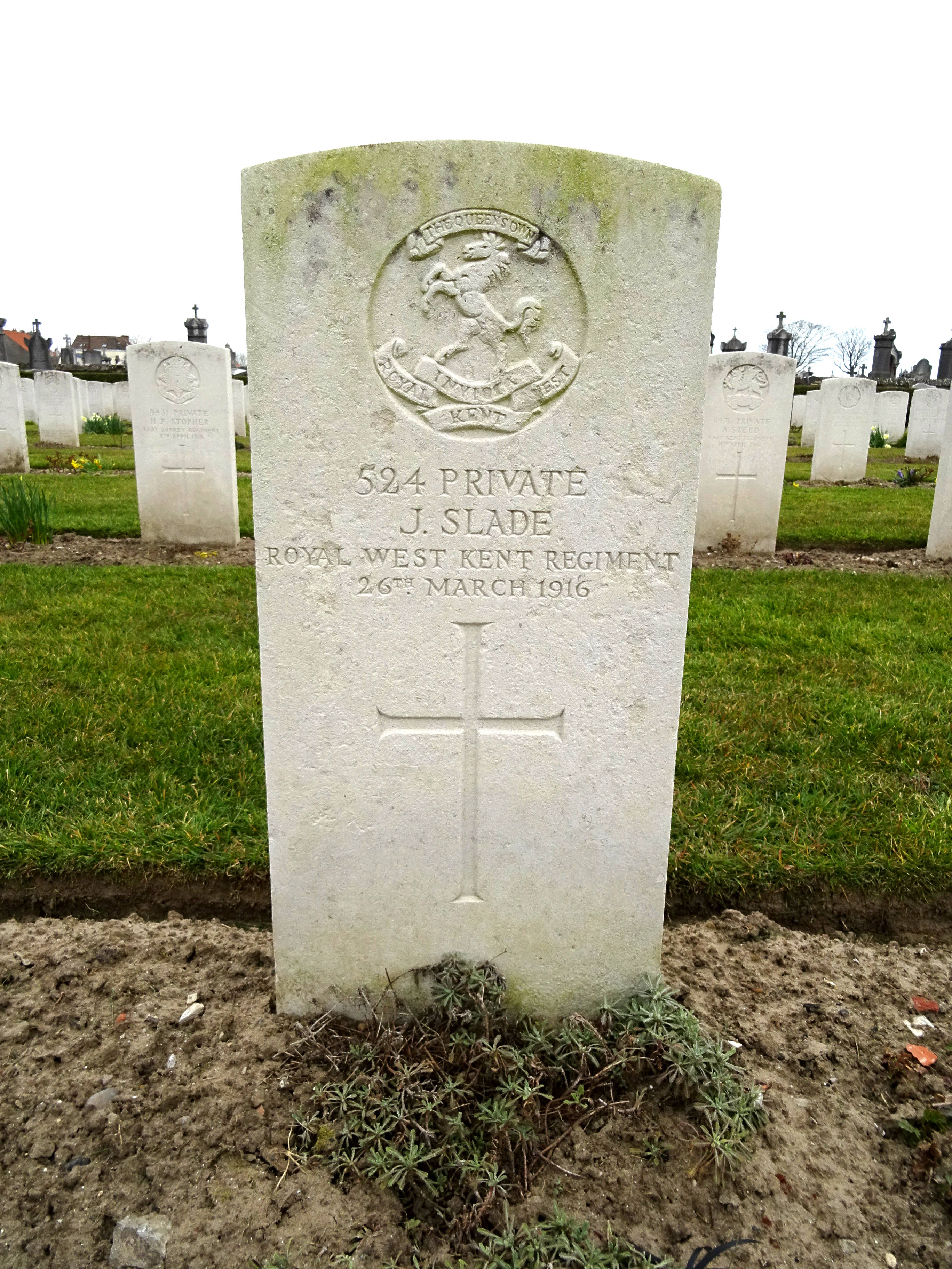 31st August 1914, enlisted; 2nd September 1914, posted Depot, Royal West Kent Regiment; 2nd September 1914, posted 6th Battalion, Royal West Kent Regiment; 1st June 1915, embarked; 29th August 1915, attached 2nd Corps Wood, cutting detachment; 1st October 1915 rejoined Unit In the Field; 4th November 1915, 7 days Field Punishment No.2.; 15th March 1916, 33 Casualty Clearing Station, wounded, grenade wound head & right hand; 27th March 1916, Lahore British General Hospital, Calais, France, reports 520 J Slade, died 2.00pm 26th March 1916, in 9 Red Cross Hospital, Calais.