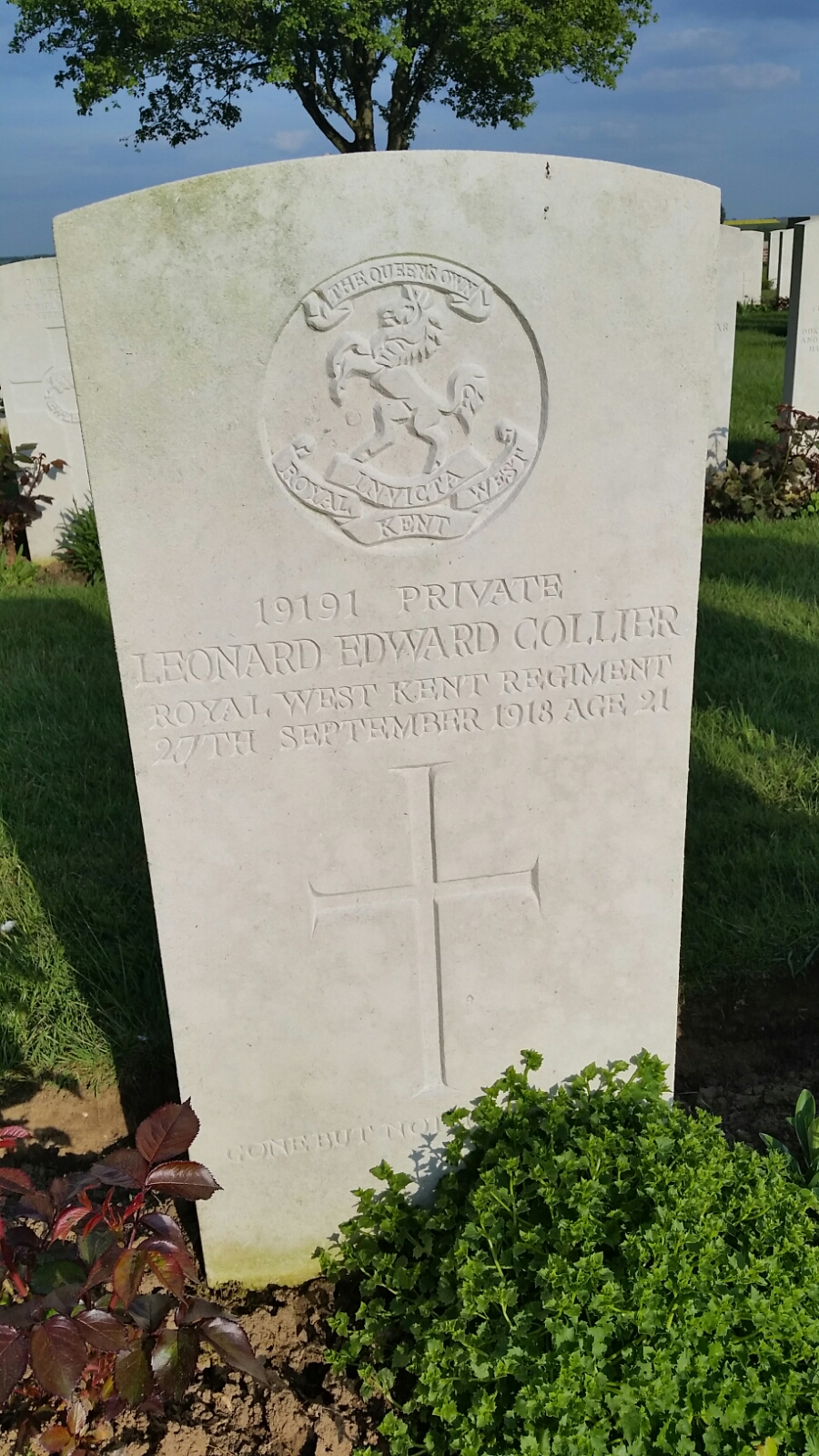 Private Leonard Edward COLLIER, G/19191, 1st Battalion, Queens Own Royal West Kent Regiment, killed in action, Flanders France, 27th September 1918, age 21.