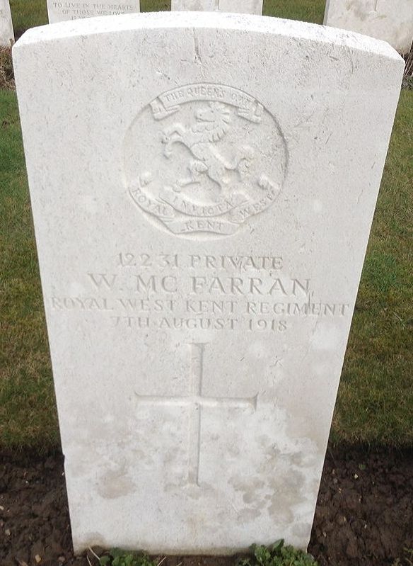 Private Walter Edwin MCFERRAN, G/12231, 7th Battalion, Queens Own Royal West Kent Regiment, died from burns face & thigh, caused by explosion & cardiac weakness, Bavarian War Hospital, Hautmont, France, whilst a Prisoner of War, 7th August 1918.