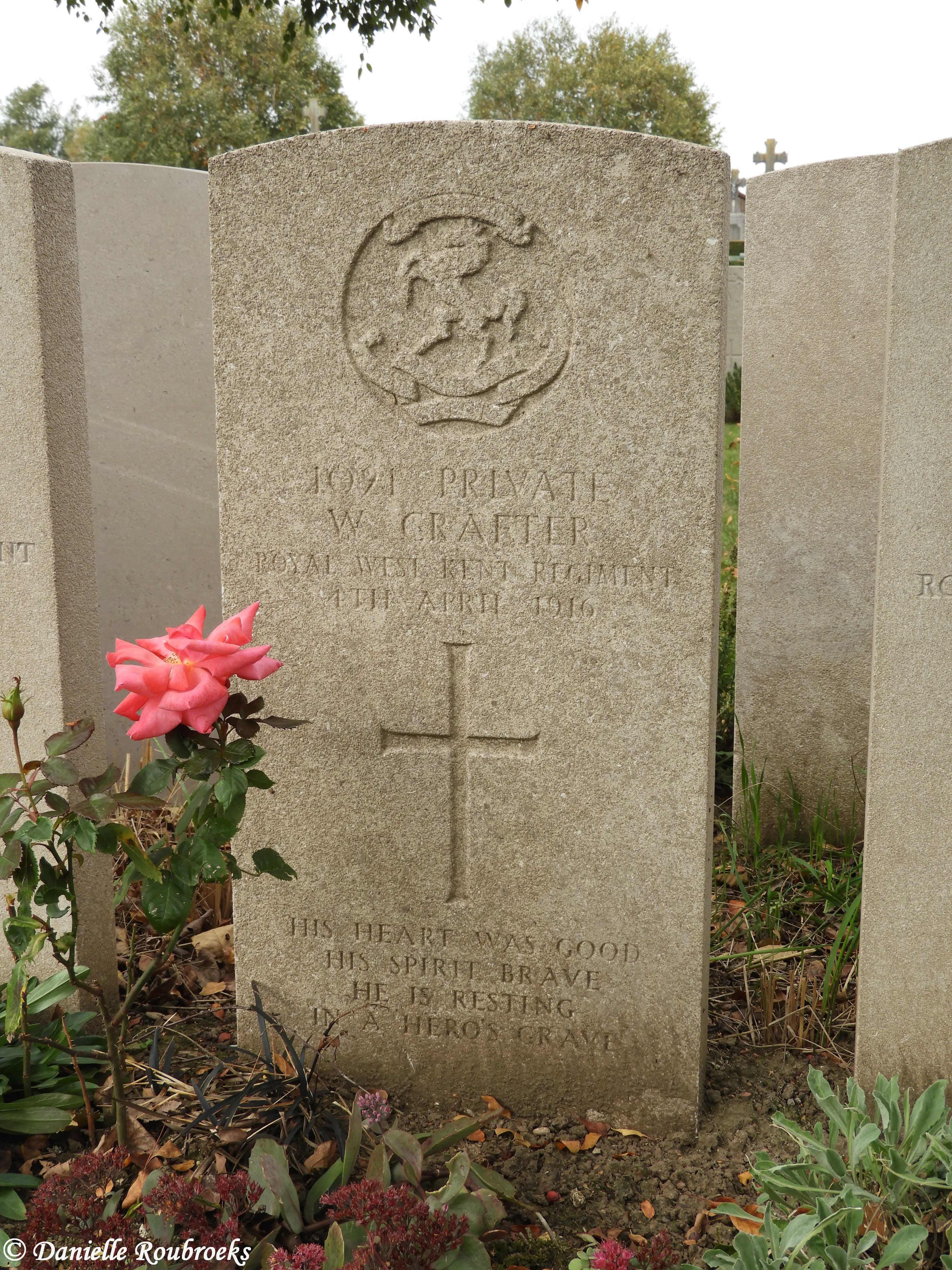 Private William Henry CRAFTER, G/1021, 6th Battalion, Queens Own Royal West Kent Regiment, died of wounds, Flanders France, 4th April 1916, age 20.