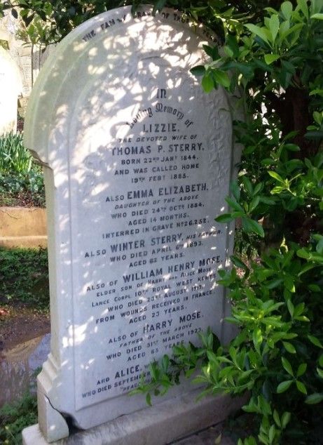 31st October 1894, St John, Holloway, Middlesex, baptism of William Henry Mose, son of Harry, (grocer), & Alice Mose, 15 Whitehall Parade.