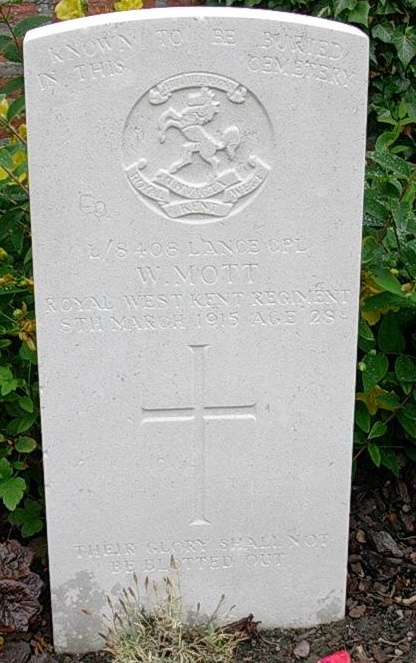 Private Walter James MOTT, L/8408, 1st Battalion, Queens Own Royal West Kent Regiment, killed in action, Flanders France, 8th March 1915, age 28.