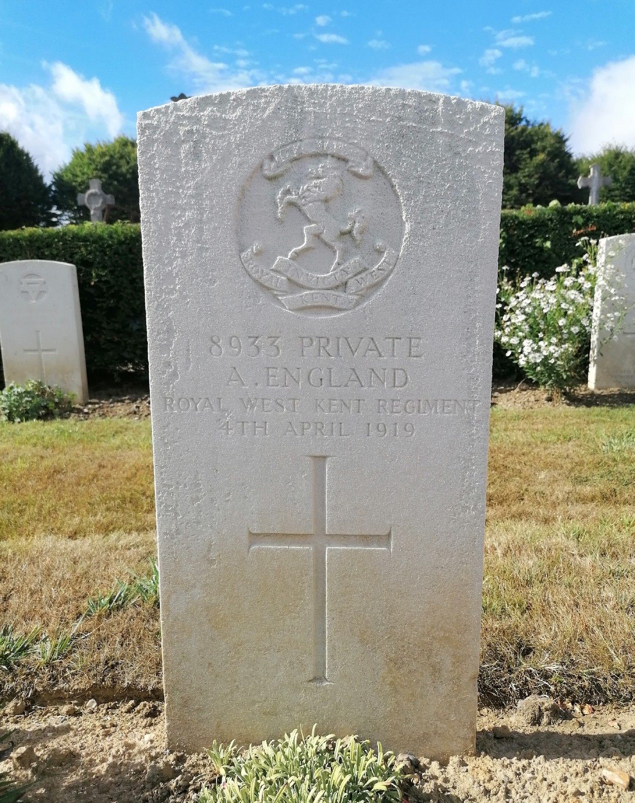 Private Alfred ENGLAND, 8933, 8th Battalion, Queens Own Royal West Kent Regiment, (attached Royal Army Service Corps, Canteens), died of a fractured skull, (accident), at 5 Stationary Hospital, Dieppe, France, 4th April 1919.