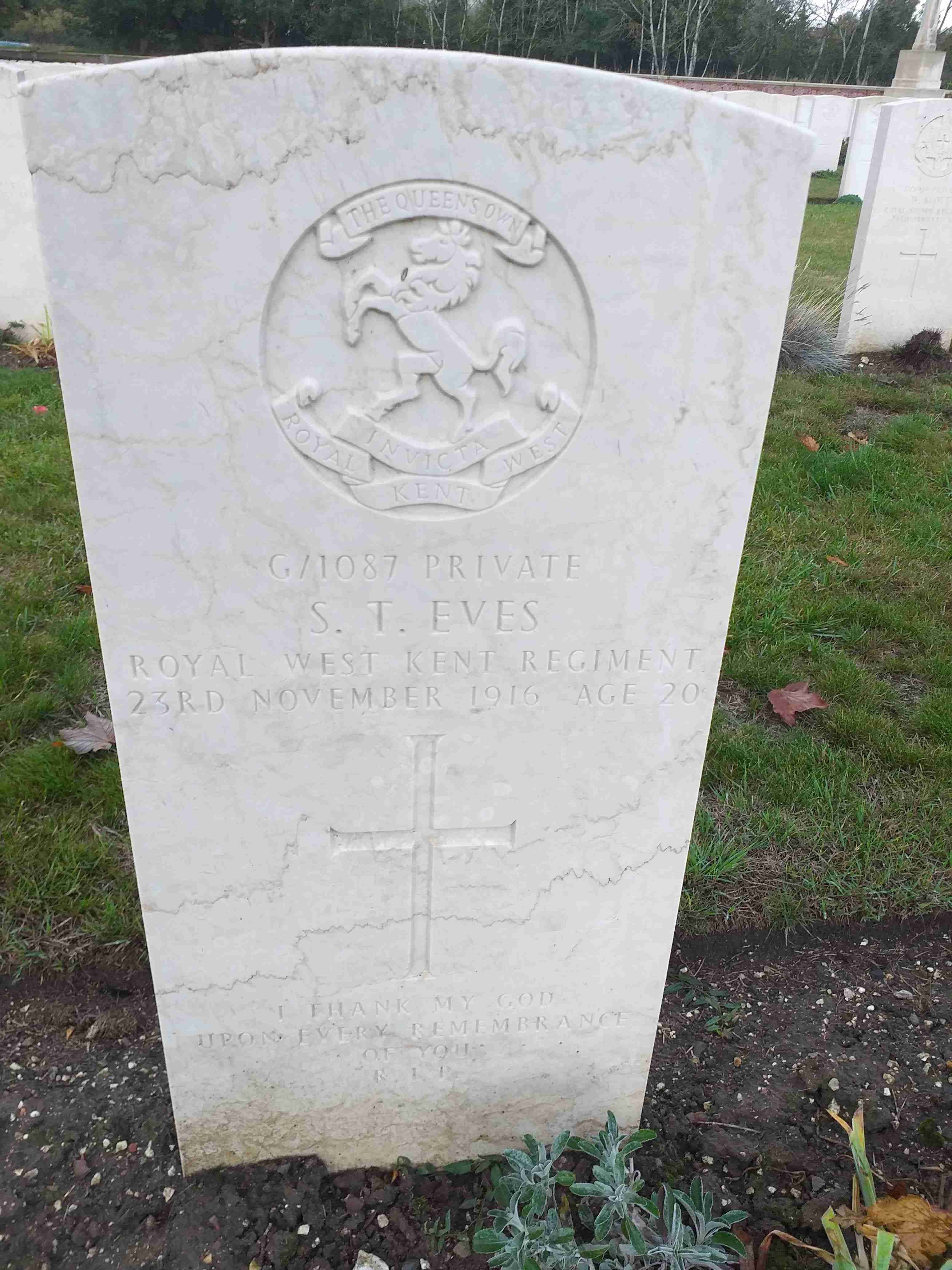 Private Sidney Thomas EVES, G/1087, 8th Battalion, Queens Own Royal West Kent Regiment, killed in action 23rd November 1916, age 20.